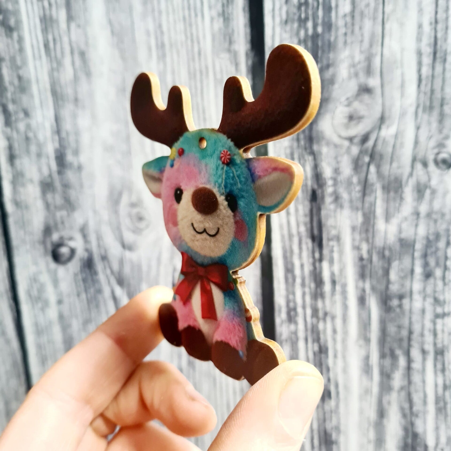 Bringe die Freude des Festes in dein Zuhause mit unserem handgefertigten Holz-Baumanhänger in Form von plüschigen Rentieren in bunten Farben! Dieser einzigartige Dekorationsartikel ist perfekt für jeden Weihnachtsbaum und fügt eine persönliche Note zu deiner Festtagsdekoration hinzu.