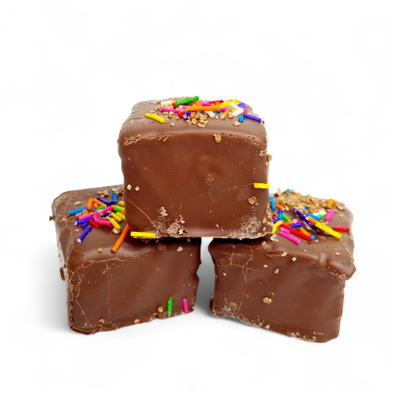 Diese Marshmallows wirbeln in knalligem Gelb und Rosa um die Wette, bevor sie komplett in ein Bad aus glatter Vollmilchschokolade tauchen. Getoppt mit bunten Streuseln und knackigen Schokolinsen, sorgt jeder Bissen für eine süße Überraschung. Ein riesiger Spaß vom ersten Knack der Schokolade bis zum letzten Fluff!
